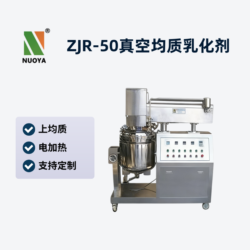 ZJR-50真空均质乳化机料锅盖为自动升降式,水、油锅中的物料通过输送管道可在真空状态下直接进入乳化锅,ZJR-50真空均质乳化机出料方式为乳化锅翻转式以及锅底阀放料式等,通过电热管对锅夹层内的导热介质进行加热来实现对物料的加热,加热温度任意设定,自动控制。在夹层内接入冷却液即可对物料进行冷却,操作简单、方便、夹层外设有保温层。该高剪切乳化机的均质系统和搅拌系统可分开使用,也可同时使用。物料的微粒化、乳化、混合、调匀、分散等可于短时间内完成。与物料接触部分采用**不锈钢(常用304,医用316L)内表面镜面抛光,真空搅拌装置卫生清洁,采用符合GMP规范的卫生标准制造,是客户理想的膏霜生产设备。